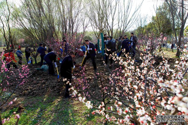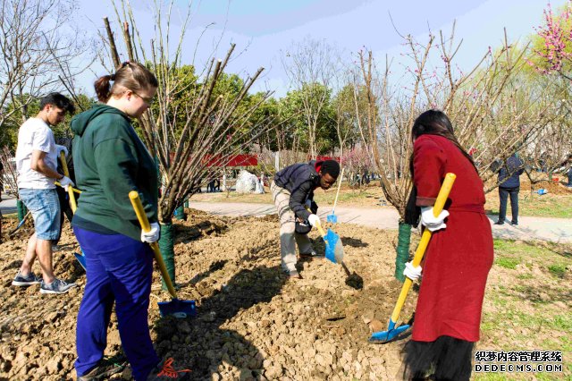 在植树现场,校领导、师生代表和园艺工人齐动手,挥锹铲土、扶树填土、浇水灌溉,在大家的共同努力下,在梅园绿化区共栽种了60株梅花、16株腊梅、6株紫薇和2株金桂树苗。